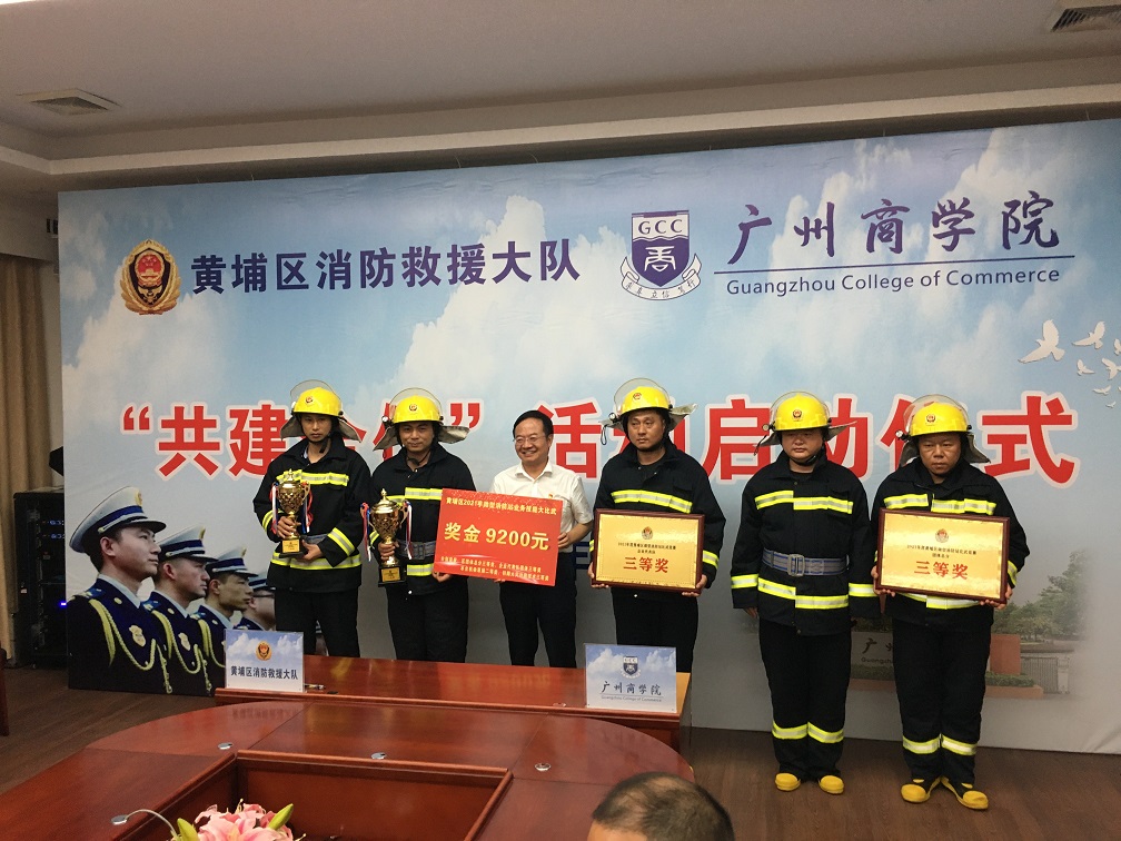 黄弢代表广州商学院为学校消防队参加区消防大比武获奖代表进行了颁奖。