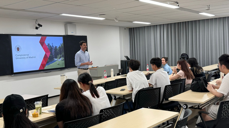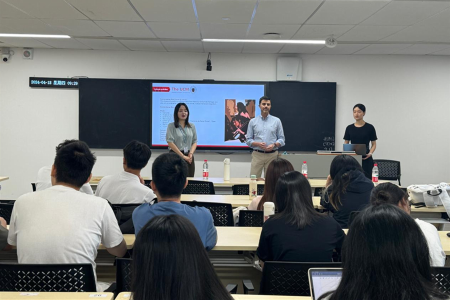 胡安·卡洛斯·伊兹格尔多先生首先对康普顿斯大学的历史背景、学术实力进行了全面介绍。作为具有700余年历史的欧洲著名院校,康普顿斯大学曾培养了7位诺贝尔奖获得者,现今QS世界排名171位。随后,他详细阐述了该校在国际教育领域的成就、为国际学生提供的各种学习机会和资源以及和中国三十余所高校(其中有北京外国语大学、上海外国语大学、复旦大学、中国人民大学和广州外语外贸大学等)合作的情况。